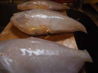 カワハギ 2021.02.13 OBさんよりカワハギを差入れ頂きました。 ホンハギと言って高級魚の1種だそうです。 サメ肌のような皮を本当に剝ぎ取って、 丸坊主にしました。 頭から切り込みを入れて(もぎ取って)、 3枚におろして、肝もあって 刺身にして頂きました。 顔も形もあるものから食材として変化させるのは 抵抗がないわけではないですが、 命の尊さと食べ物の尊さを感じました。 < >