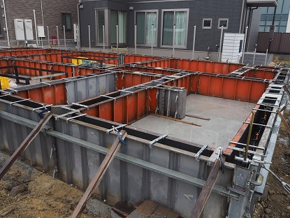 基礎コンクリート工事 2021.03.25 基礎コンクリート工事が進んでおります。 先日ベースのコンクリートを打設した後に、 立ち上がりの型枠を組んで、アンカーボルトをセットして、 打設予定の高さにポイントをセットしてコンクリートの準備を進めていきます。 < >