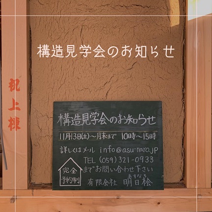 木の家の構造見学会 2021.11.17 お客さまのご厚意で先月上棟致しました現場の構造見学会を開催いたします。 予約制で開催いいたしますので、 info@asu-naro.jp までお問い合わせください。 https://www.instagram.com/p/CWS7phFJJ7e/ < >