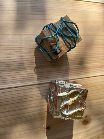 端材でアート 2022.11.03 お客さんのお子さまが木材の端材に、他の素材で包んで、 素敵なアート作品をつくっておりました。 工作教室で作ってきたようです。 今の世の中、携帯電話もあるし、ゲームもできるし たくさんの興味を注ぐものはありますが、 素材から物を作る事は発想力が育てられるますね。 < >