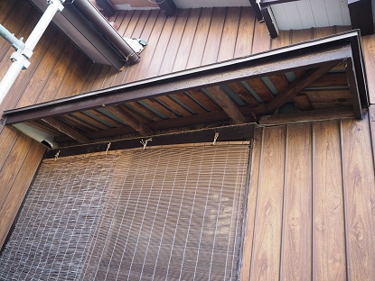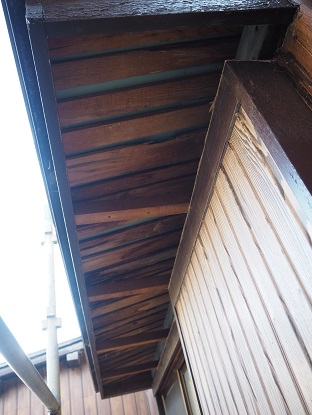 庇・軒天の貼替え工事 2021.10.29 軒天張替え工事を行います。 上から新しい軒天材の施工を検討致しましたが、 下地が無いので、古い軒天を剝がして、下地を作って新しい軒天材を施工いたします。 < >