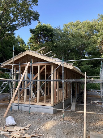 屋根下地まで終了しました。 2023.06.16 屋根の防水工事まで完了いたしました。 これで少々の雨が降っても大丈夫です。 とはいうものの2日間少々の雨は降りましたが…。 屋根はガルバリウム鋼板になります。 板金やさんが採寸に来て、屋根工事へと来週から進めて行きます。 周りが山なので、樋はつけても詰まりの原因になるので、樋は設けません。 < >